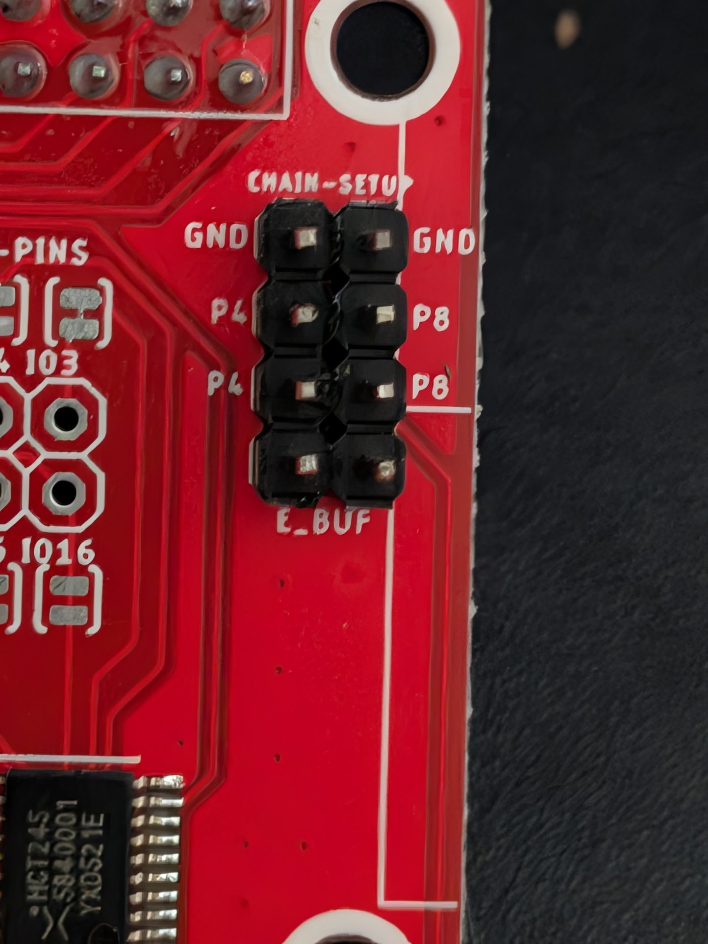 I have able to get about 1/4 of one panel working slightly with the test animation (it also seem to be cut off in some of the horizontal lines with looks due to the E line) but if I try changing the row or col to 128 or changing the chains or parallel to anything else it does not work.